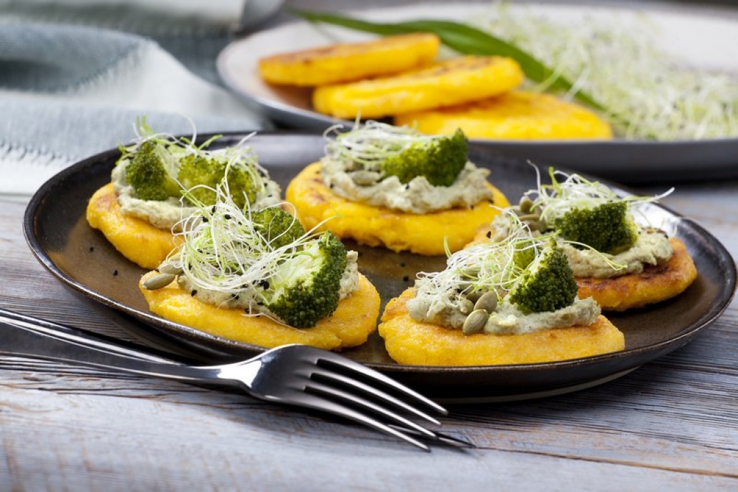 Do wrzątku dodajemy masło, sól, a następnie wsypujemy kaszkę kukurydzianą. Gotujemy polentę przez 10-15 minut, cały czas intensywnie mieszając. Odstawiamy na chwilę, po czym z jeszcze ciepłej masy formujemy placuszki i zostawiamy do całkowitego wystudzenia. W tym czasie dzielimy brokuł na małe różyczki i chwilę je gotujemy. Rozgrzewamy masło klarowane, na dużym ogniu obsmażamy placuszki z obu stron. Odsączamy z nadmiaru tłuszczu na papierze kuchennym i układamy na talerzach. Na placuszki nakładamy po łyżce pasty, dekorujemy różyczkami brokułu, ziarnami oraz kiełkami. Równie dobrze smakują ciepłe, jak i zimne.