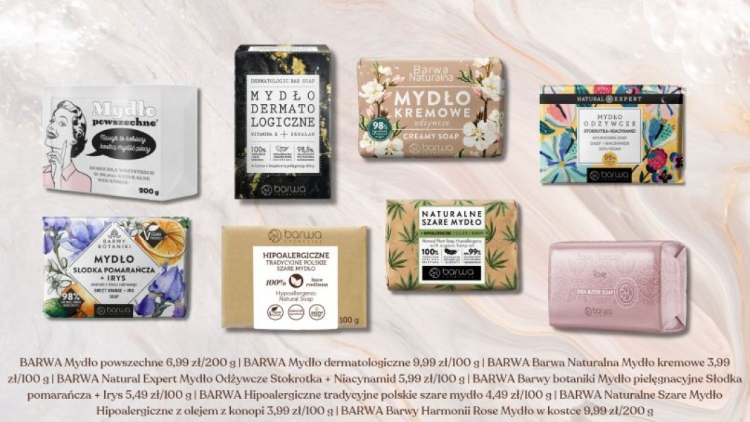 Barwa Cosmetics jest pionierem w produkcji mydeł w Polsce. Kostki produkowane przez markę są już kultowe. To dzięki nim Barwa zyskała popularność i może szczycić się mianem eksperta w ich tworzeniu. „Już w latach 70-tych rozpoczęto produkcję mydła gospodarczego - powszechnego. Później formuła mydła została zmieniona. Szare mydło, pierwotnie produkowane na tłuszczach zwierzęcych, od 2004 roku Barwa produkuje wyłącznie na bazie w 100% roślinnej. Kostki, które były wzorowane na kultowym mydle powszechnym, a nadal są obecne w portfolio marki to np.: Barwa Hipoalergiczne tradycyjne polskie szare mydło 4,49 zł/100 g lub Barwa Mydło powszechne 6,99 zł/200 g. Nazwa szare mydło jest pozostałością historyczną. Nasze mydło nie zawiera dodatków zapachowych oraz barwiących (kolor i zapach jest wynikiem użytych surowców). Mydłem szarym nazywane jest również mydło bez dodatków zapachowych, czy też barwiących. Od lat jest doceniane