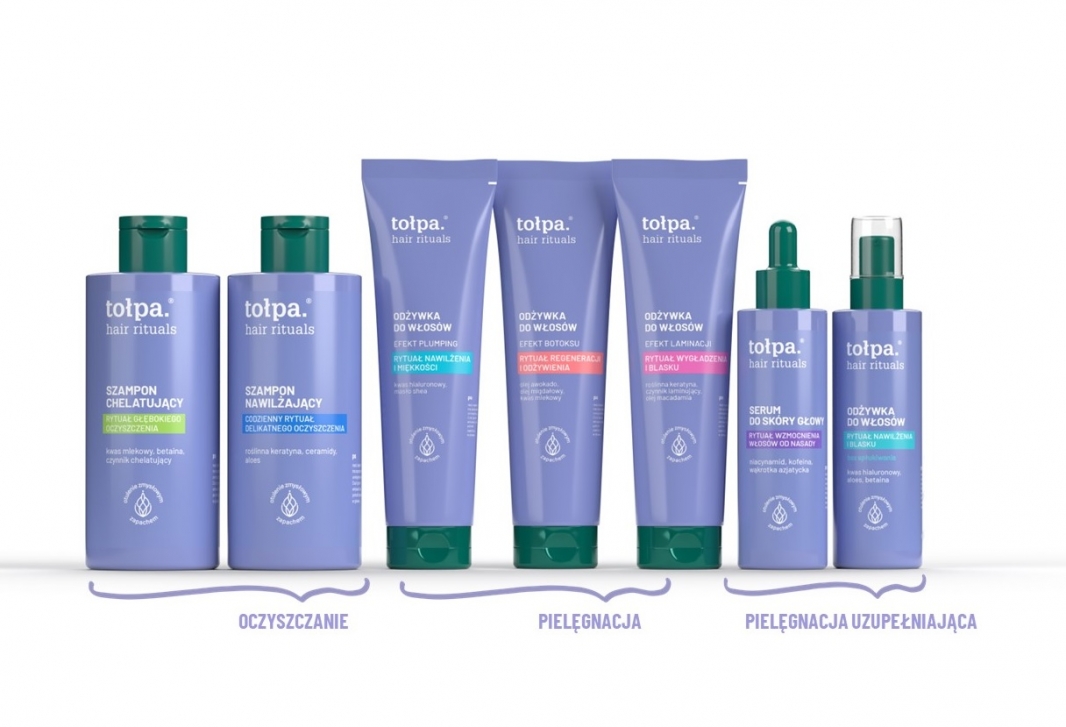 Marka tołpa przez lata zdobyła zaufanie konsumentów w kategorii pielęgnacji twarzy. Teraz wprowadzając linię tołpa. hair rituals wkraczamy na nowe „tereny” i mamy w planach podbić serca włosomaniaczek! Świadomość na temat pielęgnacji włosów jest coraz większa. Jednak rozpoznanie ich potrzeb to… nie lada wyzwanie. Dlatego stworzyliśmy rytuały pielęgnacyjne, które ułatwią wybór kosmetyku i połączą pożyteczne z przyjemnym. Bo dobry rytuał pielęgnacyjny to nie tylko skuteczność, ale także czas dla siebie. Uczta dla zmysłów, która pozwala zapomnieć się na chwilę. W formułach kosmetyków obok najskuteczniejszych składników pielęgnacyjnych, takich jak: kwas hialuronowy, ceramidy, kwas mlekowy, CICA zamknięto delikatne nuty zapachowe, które potrafią zawrócić w…i na niejednej głowie. Koncepcja produktów idealnie wpisuje się w popularne w salonach fryzjerskich i wśród włosomaniaczek zabiegów. Pomogą one uzyskać nam pożądany efekt chelatowania, plumpingu, laminacji czy botoksu.