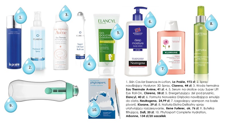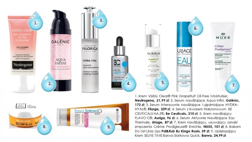 Polecane kosmetyki: 1. Serum intensywnie nawilżające Aqua Infini, Galénic, 172 zł/30 ml (w aptekach); 2. Skoncentrowane serum intensywnie nawilżające i ujędrniające skórę HYDRA-HYAL®, Filorga, 209 zł/30 ml; 3. Serum z kwasem hialuronowym BE CEUTICALS HA.5%, Be Ceuticals, 210 zł/35 ml; 4. Serum Aktywnie Nawilżające Eau Thermale, Uriage, 87 zł/30 ml; 5. Neutrogena® Formuła Norweska Głęboko nawilżająca emulsja do ciała, Neutrogena, 24,99 ZŁ/400 ml; 6. Zabieg z krystalicznym kolagenem z czarnymi minerałami i algami, Sharley, 200 zł.