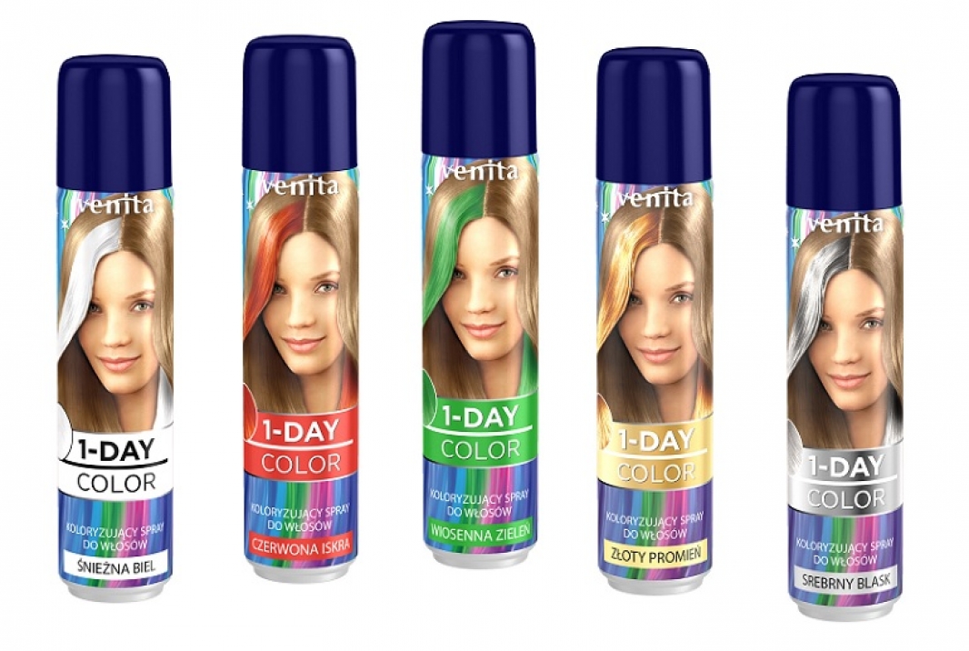 Sprej koloryzujący do włosów Venita 1 Day Color produkt marki Venita do jednodniowej koloryzacji włosów. Jest łatwy i szybki w aplikacji, zmywalny po pierwszym myciu. Produkt nie zawiera barwników trwale koloryzujących, rozjaśniaczy i utleniaczy, dzięki czemu jest bezpieczny dla włosów, a kolor łatwo usunąć – wystarczy zmyć go szamponem.