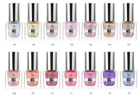 Metals Metallic Nail Color to najnowsza linia lakierów do paznokci od Golden Rose. Intrygujące wykończeniem emalie zawierają metaliczno-perłowe pigmenty, dzięki którym na paznokciach uzyskujemy efekt roztopionych stopów metali. Do linii tych lakierów zalicza się aż 14 modnych kolorów o intensywnym, trwałym pokryciu. Lakiery idealnie sprawdzą się zarówno w okresie karnawału, jak i na co dzień, jako połyskliwy akcent uzupełniający stylizację.