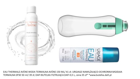 Eau Thermale Avène woda termalna Avène 150 ml/ 41 zł; Urgiage nawilżająco-ochronna mgiełka termalna SP30 50 ml/ 39 zł; Dafi butelka filtrująca Dafi 0,5 L, cena 35 zł.