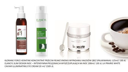 Klorane Force Keratine koncentrat przeciw reakcyjnemu wypadaniu włosów (bez spłukiwania) 125ml/ 130 zł; Elancyl Slim Design Noc – intensywna pielęgnacja wyszczuplająca na noc 200ml/ 130 zł;; La Prairie White Caviar Illuminating Eye Cream 20 ml/ 1509 zł.