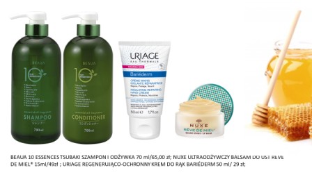 Nuxe ultraodżywczy balsam do ust Reve De Miel 15ml/49zł ; Uriage regenerująco-ochronny krem do rąk Bariéderm 50 ml/ 29 zł; Beaua 10 Essences Tsubaki szampon i odżywka 70 ml / 65,00 zł.