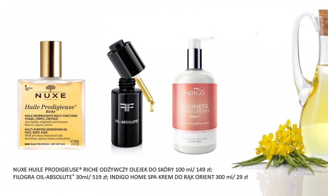 Nuxe Huile Prodigieuse Richeodżywczy olejek do skóry 100 ml/ 149 zł; Filogra Oil-Absolute 30ml/ 519 zł; Indigo Home Spa krem do rąk orient 300 ml/ 29 zł.