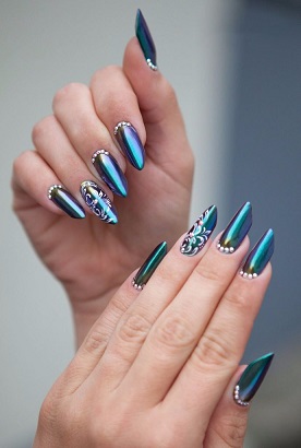 Najbardziej spektakularny i przyciągający oko efekt uzyskamy poprzez nałożenie dużych, mocno mieniących się cyrkonii Svarovskiego. Opcjonalnym wariantem jest wykorzystanie delikatnych perełek lub dostępnych w mniejszych rozmiarach - klasycznych cyrkonii, które możemy porozrzucać po całym paznokciu. Wówczas manicure awansuje do poziomu glamour. Efekt splendoru rodem z Hollywood uzyskamy jednak dzięki bogatej gamie pyłków. W przypadku techniki tzw. syrenki tworzą one na paznokciach bajkową poświatę. Możemy także zdecydować się na tzw. Mirror efect, czyli o powierzchni lustra czy Chameleon – dający efekt skóry tego zmieniającego barwę zwierzęcia.