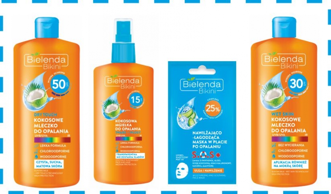 Tegoroczna, najnowsza odsłona kosmetyków Bielenda Bikini, została wzbogacona o nowe produkty: Kokosowa mgiełka do opalania SPF 15 Twarz + włosy, Kokosowe mleczko do opalania z technologią Wet Skin SPF 30, Kokosowe mleczko do opalania z technologią Dry Touch SPF 50 oraz Nawilżająco-łagodząca maska po opalaniu SOS w płacie.