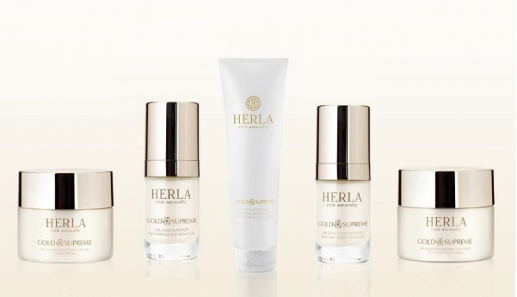 W skład złotej linii wchodzą produkty do pielęgnacji twarzy i ciała. Nowością jest Herla Gold Supreme 24k Liftingujący suchy olejek do twarzy z drobinkami 24k złota, który jest kompozycją ultra odżywczych olejów: arganowego, jojoba, z ogórecznika lekarskiego, z pestek jabłek, jagód acai oraz pestek winogron. Nawilża, odżywia, regeneruje i łagodzi skórę, a przy tym doskonale się wchłania. Złoto stymuluje syntezę kolagenu i działa antybakteryjnie. Ekstrakt olejowy z lawendy hiszpańskiej Lavandula stoechas zmniejsza widoczność zmarszczek. Roślinny Phytosqualan posiada właściwości antyoksydacyjne i nawilżające. Olejek ma działanie liftingujące, przeciwzapalne oraz przeciwstarzeniowe. Polecany jest do każdego typu cery do stosowania samodzielnie na dzień lub na noc, albo jako serum dodawane do kremu.
