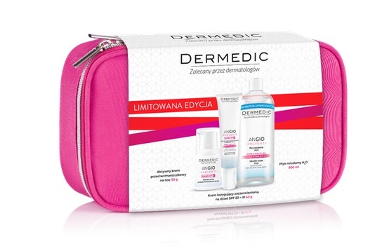 Zestaw Angio zawiera Krem korygujący zaczerwienienie na dzień SPF 20 + IR 40 g + Aktywny krem przeciwzmarszczkowy na noc 55 g + Płyn micelarny 500 ml. Krem korygujący zaczerwienienie na dzień natychmiast wycisza i zmniejsza widoczność rozszerzonych naczyń krwionośnych oraz redukuje obrzęk. Aktywny krem przeciwzmarszczkowy na noc regeneruje wrażliwą skórę naczynkową i opóźnia jej procesy starzenia się, przeciwdziała powstawaniu wolnych rodników. Wzmacnia ścianki kapilar, zmniejsza ich przepuszczalność i skłonność do rozszerzania się. Płyn micelarny skutecznie usuwa makijaż i wszelkie zanieczyszczenia pozostawiając uczucie świeżości i czystości.