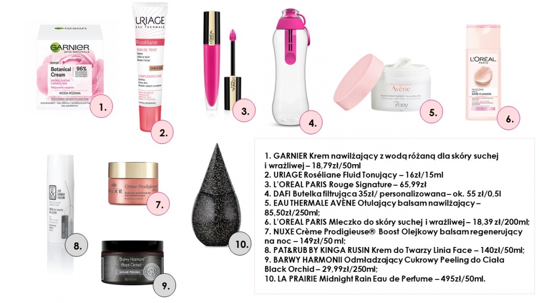 Wypróbuj: GARNIER Krem nawilżający z wodą różaną dla skóry suchej i wrażliwej – 18,79zł/50ml; Uriage Roséliane Fluid Tonujący – 16zł/15ml; Dafi Butelka filtrująca personalizowana – ok. 55 zł/0,5l; L’OREAL PARIS Rouge Signature – 65,99zł; ARBONNE It’s All In The Eyes – paletka cieni – 239zł/12g.