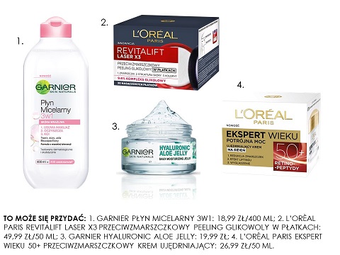 To może się przydać: 1. Garnier płyn micelarny 3w1: 18,99 zł/400 ml; 2. L’orèal Paris Revitalift Laser x3 przeciwzmarszczkowy peeling glikowoly w płatkach: 49,99 zł/50 ml; 3. Garnier Hyaluronic Aloe Jelly: 19,99 zł; 4. L’orèal Paris Ekspert wieku 50+ przeciwzmarszczkowy krem ujędrniający: 26,99 zł/50 ml.