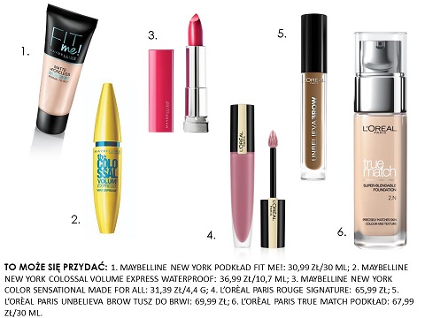 To może się przydać: 1. Maybelline New York podkład fit me!: 30,99 zł/30 ml; 2. Maybelline New York Colossal Volume Express Waterproof: 36,99 zł/10,7 ml; 3. Maybelline New York Color Sensational Made For All: 31,39 zł/4,4 g; 4. L’orèal Paris Rouge Signature: 65,99 zł; 5. L’orèal Paris Unbelieva Brow tusz do brwi: 69,99 zł; 6. L’orèal paris true match podkład: 67,99 zł/30 ml.