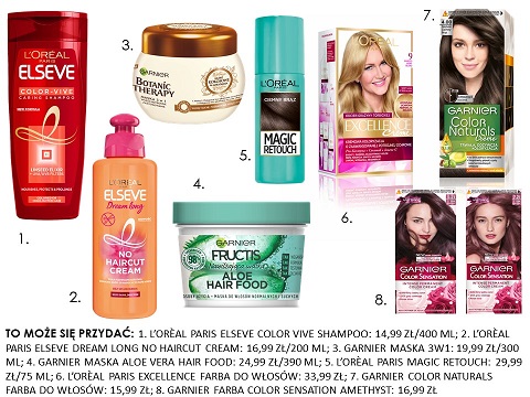 To może się przydać: 1. L’orèal Paris Elseve Color Vive Shampoo: 14,99 zł/400 ml; 2. L’orèal Paris Elseve Dream Long No Haircut Cream: 16,99 zł/200 ml; 3. Garnier Maska 3W1: 19,99 zł/300 ml; 4. Garnier Maska Aloe Vera Hair Food: 24,99 zł/390 ml; 5. L’orèal Paris Magic Retouch: 29,99 zł/75 ml; 6. L’orèal Paris Excellence farba do włosów: 33,99 ZŁ; 7. Garnier Color Naturals farba do włosów: 15,99 ZŁ; 8. Garnier Farba Color Sensation: 16,99 zł.
