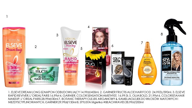 Przyda się: 1. Elseve Dream Long Szampon Odbudowujący 14,99zł/400ml, 2. Garnier Fructis Aloe Hair Food 24,99zł/390ml, 3. Elseve Rapid Reviver, L’oreal Paris 16,99zł 4. Garnier, Color Sensation Amethyst, 16,99 Zł 5. Olia Bold, 21,99zł 6. Colorista Hair Makeup, L’oreal Paris 28,99zł/30ml 7. Botanic Therapy Olejek Arganowy & Kameliaolejek Do Włosów Matowych I Niezdyscyplinowanych, Garnier 29,99zł/150ml 8. Stylista Mgiełka #Beachwaves 28,99zł/200ml.