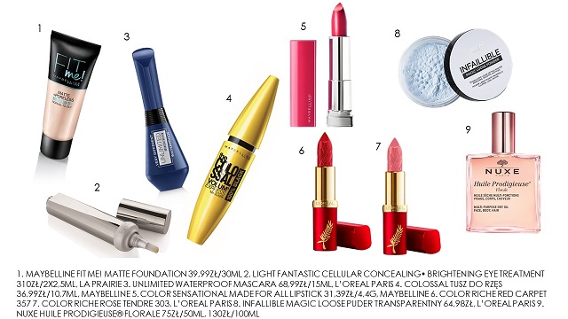 Przyda ci się: 1. Maybelline Fit Me! Matte Foundation 39,99zł/30ml 2. Light Fantastic Cellular Concealing• Brightening Eye Treatment 310zł/2x2,5ml, La Prairie 3. Unlimited Waterproof Mascara 68,99zł/15ml, L’oreal Paris 4. Colossal Tusz Do Rzęs 36,99zł/10,7ml, Maybelline 5. Color Sensational Made For All Lipstick 31,39zł/4,4g, Maybelline 6. Color Riche Red Carpet 357 7. Color Riche Rose Tendre 303, L’oreal Paris 8. Infallible Magic Loose Puder Transparentny 64,98zł, L’oreal Paris 9. Nuxe Huile Prodigieuse Florale 75zł/50ml, 130zł/100ml.