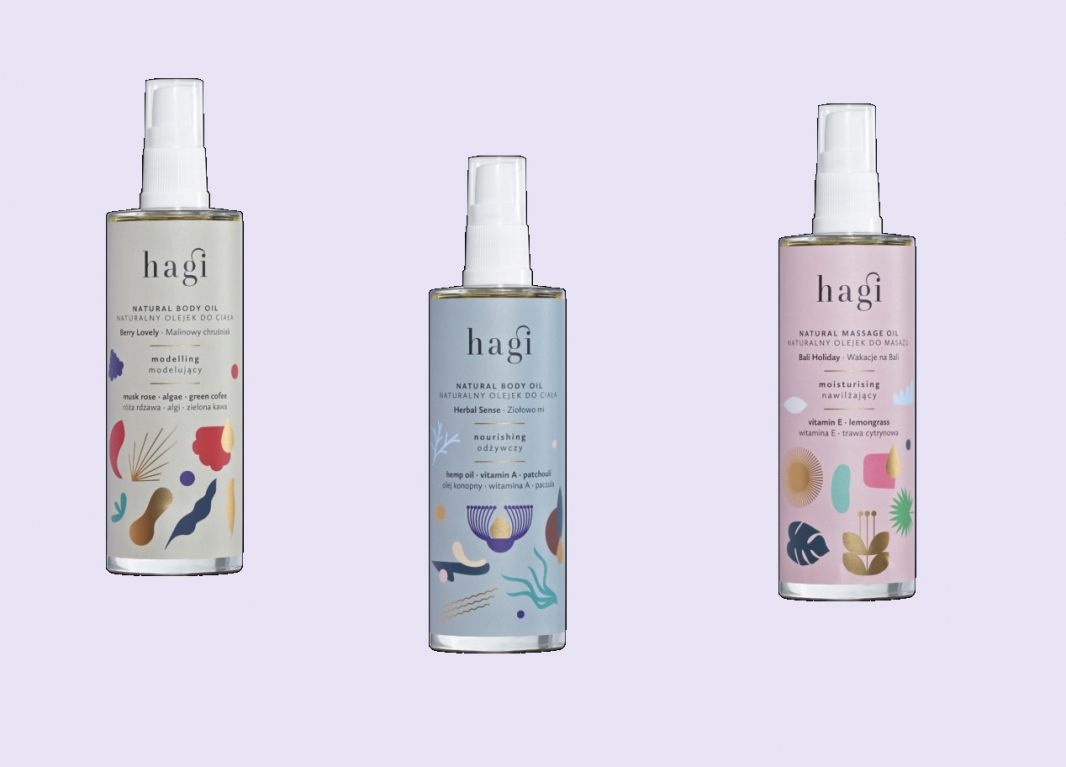 Wszystkie produkty powstały na bazie naturalnych składników, wyciągów z roślin, olejków eterycznych i witamin. Każdy z nich ma inne działanie i oryginalny zapach: ziołowo-kwiecistej łąki, soczystych malin i tropikalnej wyspy. Wśród nowości Hagi znajdziemy olejek odżywczy z bogatą mieszanką zimno tłoczonych olei i witamin, modelujący o właściwościach redukujących cellulit oraz nawilżający, który idealnie sprawdzi się do masażu.