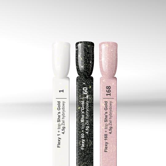 Kolekcja Flexy Icy Ligths to trzy żele hybrydowe w odcieniach bieli (01), czerni (60) i jasnego różu (168) oraz top ze złotymi płatkami. Dzięki takiemu połączeniu stworzysz elegancką i efektowną stylizację paznokci w zimowym wydaniu. Taki mieniący się światłem manicure nie tylko przyciąga uwagę, ale również sprawia, że przeniesiesz się w samo centrum magicznego Londynu. Dzięki takiej stylizacji poczujesz się jak na zaśnieżonym Oxford Street, gdzie przy filiżance kakao z różowymi piankami można podziwiać bajkowe złote iluminacje na tle wieczornego nieba.