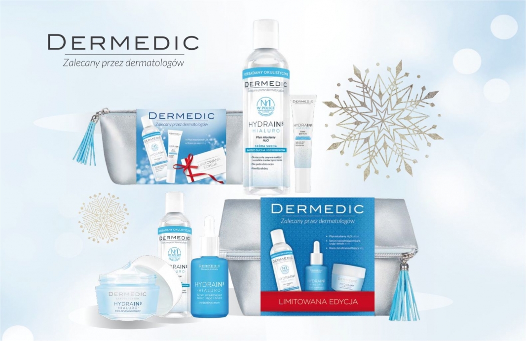 Zestawy kosmetyków Dermedic będzie można nabyć zarówno w modnych srebrnych kosmetyczkach jak i eleganckich pudełkach. W zestawach znalazły się bestsellery Dermedic - kosmetyki z serii nawilżającej Hydrain 3 Hialuro, przeznaczone do codziennej pielęgnacji skóry suchej i odwodnionej.