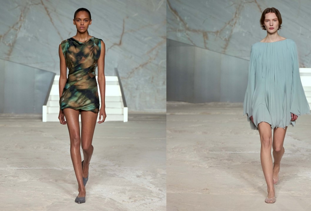 Marmurowe ściany otaczające wybieg stanowiły imponujący kontrast dla czystego minimalizmu i rzeźbiarskich linii, które charakteryzują nową kolekcję. Modele wychodzili z marmurowej jaskini, by przemierzać stalowe schody, prezentując łącznie 35 stylizacji. Pokaz stworzył wyraźny dialog między strukturą a płynnością, siłą a miękkością.