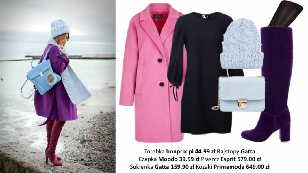 Polskie Morze zawsze jest fantastycznym pomysłem na weekendowy wyjazd. Sprawmy, aby nasz outfit emanował kolorem i energią. Tym razem wybierzmy płaszcz w odcieniu intensywnego różu, fioletowe kozaki i dodatki w kolorze baby blue. Jedyną klasyczną częścią naszej stylizacji pozostanie czarna sukienka przed kolano.