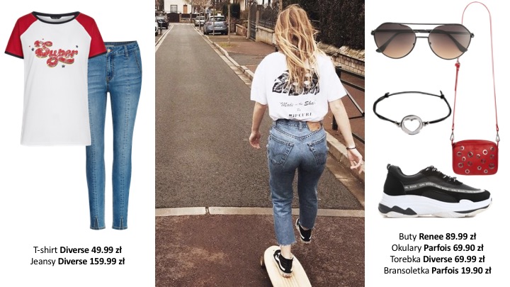 Jazdę na czterech kółkach idealnie uzupełni wygodna stylizacja złożona ze, zdobionego printem lub subtelnymi cekinami, T-shirtu oraz dopasowanych jeansów. Basicową stylizację uzupełniamy o zdobione dodatki – nerkę wyglądem przypominającą pochlapaną farbą, torebkę w kolorze intensywnej czerwienie, czy też buty z akcentem holo.
