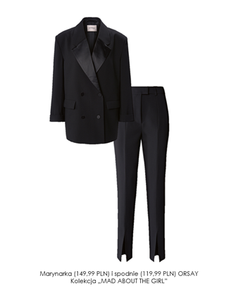 Dla miłośniczek męskiego (i jakże modnego w tym sezonie!) stylu, Orsay przygotował wyjątkową propozycję – czarny garnitur obok którego nikt nie przejdzie obojętnie. Klasyczne spodnie w kant zyskały nowe oblicze dzięki ciekawym rozcięciom na końcu nogawek. Prawdziwą perełkę stanowi jednak marynarka. Oversizowa, z wyraźnie podkreślonymi i modowo przerysowanymi ramionami oraz satynową klapą i powlekanymi guzikami. Ten zestaw to fantastyczna propozycja dla pewnych siebie miłośniczego high fashion, nie tylko na specjalne okazje.