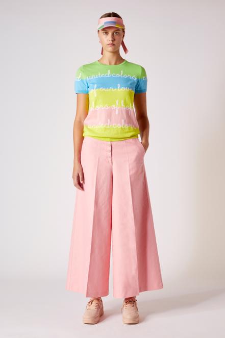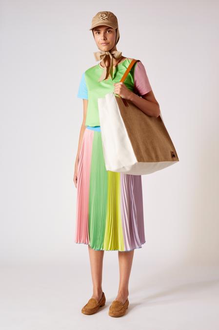 Uwielbiana przez Jean-Charles Castelbajaca tęcza ma w tym sezonie odcień pastelowy – pudrowe róże, turkusy i błękity dodają nam radości i energii. Lato to czas na len – jak zawsze w kolekcji Benettona pojawią się przewiewne lekkie sukienki maxi, koszule, marynarki i spodnie. Włoska marka zabierze nas w podróż do gorącej Portugalii – przypominając kolorami piasek plaż, a haftem biel i błękit azulejos. Sukienki mają bufiaste rękawy, t-shirty dziewczęce lekkie bufki. W linii denim - ultra modne szerokie spodnie, kurtki i spódnice.