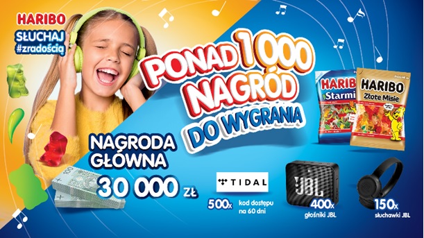 Mechanika akcji jest prosta i nie wymaga dużego zaangażowania konsumentów. Aby wziąć udział w loterii „Słuchaj z radością” należy w dniach od 1 maja do 30 czerwca br. zakupić jeden, dowolny produkt HARIBO, zachować dowód zakupu, a następnie zarejestrować go na stronie www.sluchajzradoscia.pl i czekać na natychmiastową informację o wygranej! Wśród nagród znajduje się 500 kodów dostępu na 60 dni do platformy TIDAL, 400 głośników JBL i 150 bezprzewodowych słuchawek JBL. Dodatkowo, na koniec aktywacji, spośród wszystkich zgłoszeń wylosowane zostanie jedno, któremu przyznana zostanie nagroda główna w wysokości 30 000 zł.