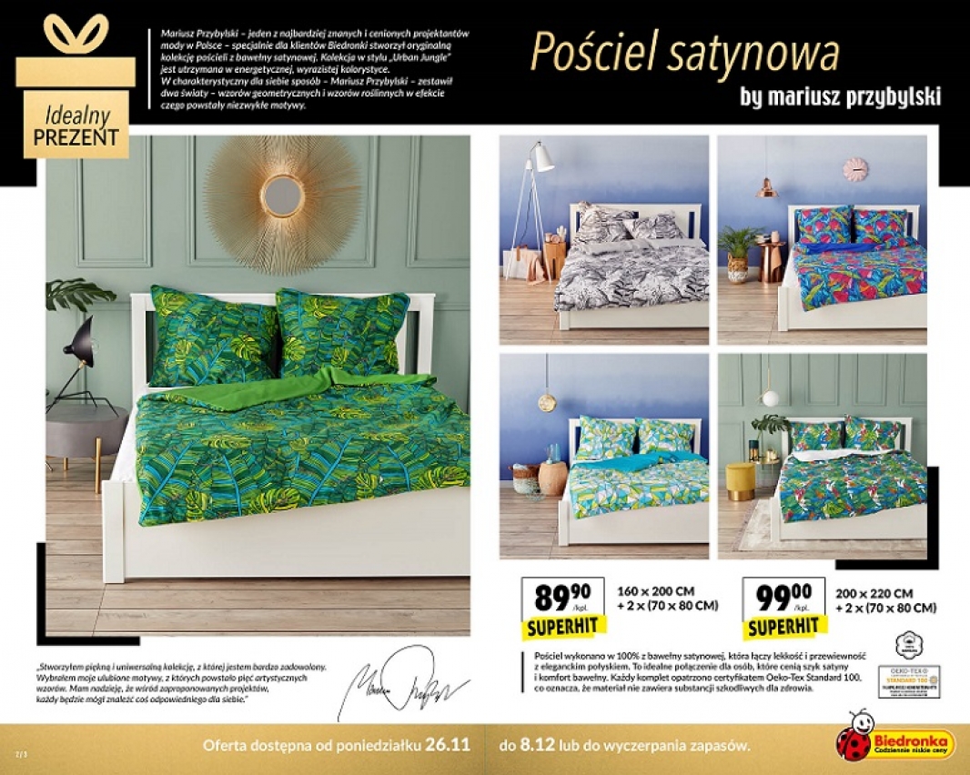 Świat roślinny i geometryczne wzory to motywy przewodnie nowej kolekcji pościeli stworzonej przez projektanta dla Biedronki. 5 różnych wzorów w dwóch rozmiarach dostępnych będzie we wszystkich sklepach sieci od 26 listopada w cenie 89,90 zł lub 99,00 zł.