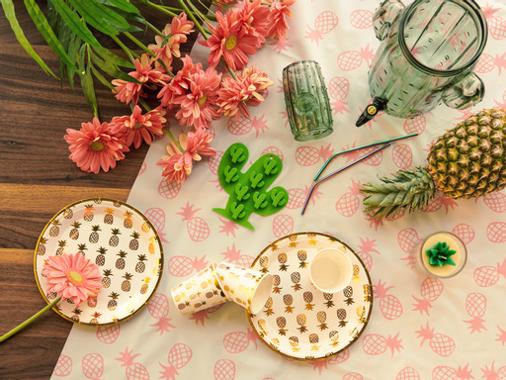 Kolekcja Garden Party powstała z myślą o plenerowych imprezach, plażowych piknikach i spotkaniach w parku. Jej podstawę stanowią klasyczne koce w soczystych odcieniach lawendy, różu, turkusu lub oranżu. Pozostałe elementy wpisują się w kilka wiodących motywów, które umożliwią stworzenie spójnej oprawy wydarzenia. Wzrok przykuwają zdobne kieliszki w kształcie flaminga oraz silikonowe foremki do kostek lodu do kompletu. Towarzyszą im jednorazowe talerzyki i kubeczki w ananasy oraz dzbanek z kranikiem i szklanki w kształcie kaktusów. W kolekcji nie zabrakło też praktycznych akcesoriów, które sprawdzą się niezależnie od charakteru imprezy, takich jak przenośny zestaw do krojenia owoców, wielorazowe słomki lub butelki na wodę z atrakcyjnymi motywami. Ofertę uzupełniają różne wzory efektownych, papierowych dekoracji, które po złożeniu bez problemu zmieszczą się w koszu piknikowym.