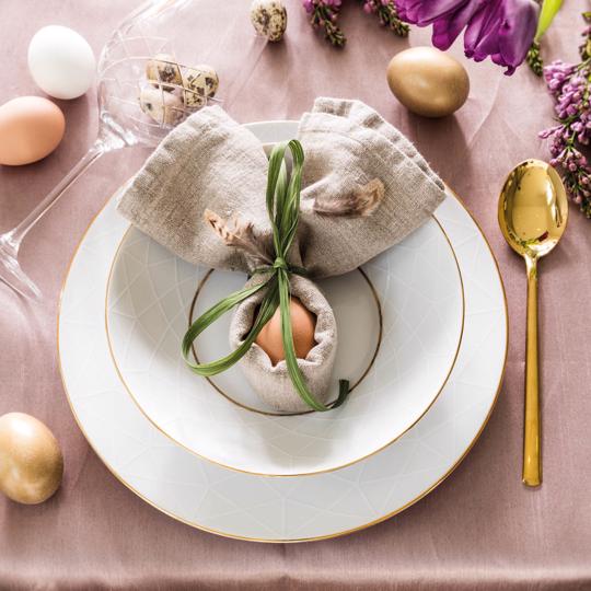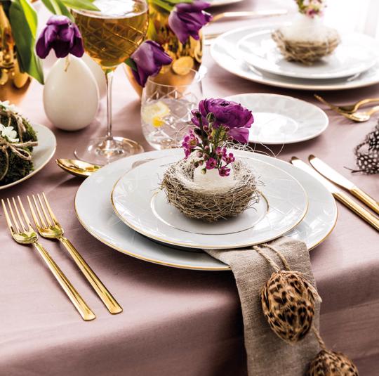 Stół wielkanocny mieniący się złotymi i diamentowymi detalami? Do takiej aranżacji najlepszym wyborem będzie porcelana Diamond, utrzymana w kolorze perły i srebrzystej bieli, na tle których niezwykły efekt tworzy wzór inspirowany diamentowymi szlifami. Wrażenie luksusu potęgują ręcznie malowane zdobienia z 18-karatowego złota. Wspaniałą kompozycję stworzymy stawiając te naczynia na naturalnym obrusie, w kolorze zgaszonego różu. Do tego złote sztućce i nieodzowne bukiety żółtych żonkili oraz fioletowych tulipanów.