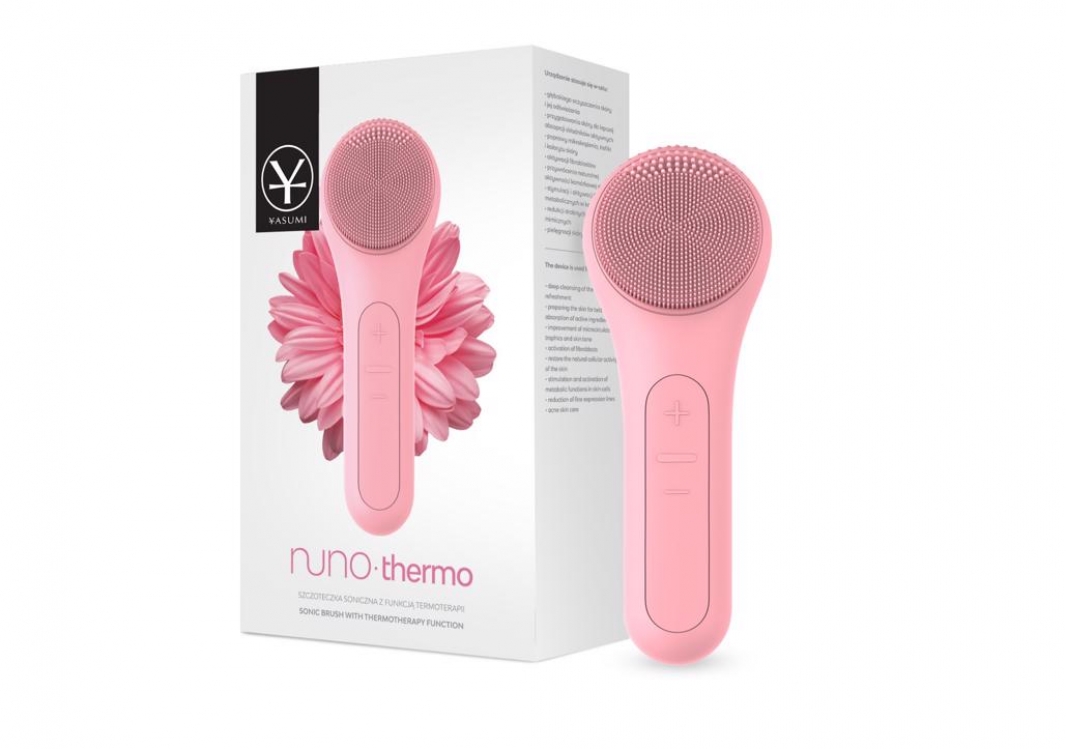 Yasumi Nuno Thermo to wyjątkowa szczoteczka soniczna wyposażona w miękką, silikonową końcówkę, która dzięki pulsacji efektywnie oczyszcza skórę z wszelkich zanieczyszczeń. Delikatnie masuje, dzięki czemu poprawia mikrokrążenie, a tym samym przyswajanie składników aktywnych. Szczoteczka oferuje 6 poziomów intensywności wibracji oraz termoterapię. Wytwarzane ciepło dociera do głębszych warstw skóry, uruchamia procesy naprawcze na poziomie komórkowym, wzmacnia ściany naczyń włosowatych, zwiększa przepływ krwi i limfy, redukuje cienie pod oczami i drobne zmarszczki. Dodatkowo relaksuje mięśnie twarzy, szyi i dekoltu. W Yasumi Nuno Thermo wykorzystano nowoczesną technologię IPX7, dzięki czemu szczoteczka jest bezpieczna w użytkowaniu.