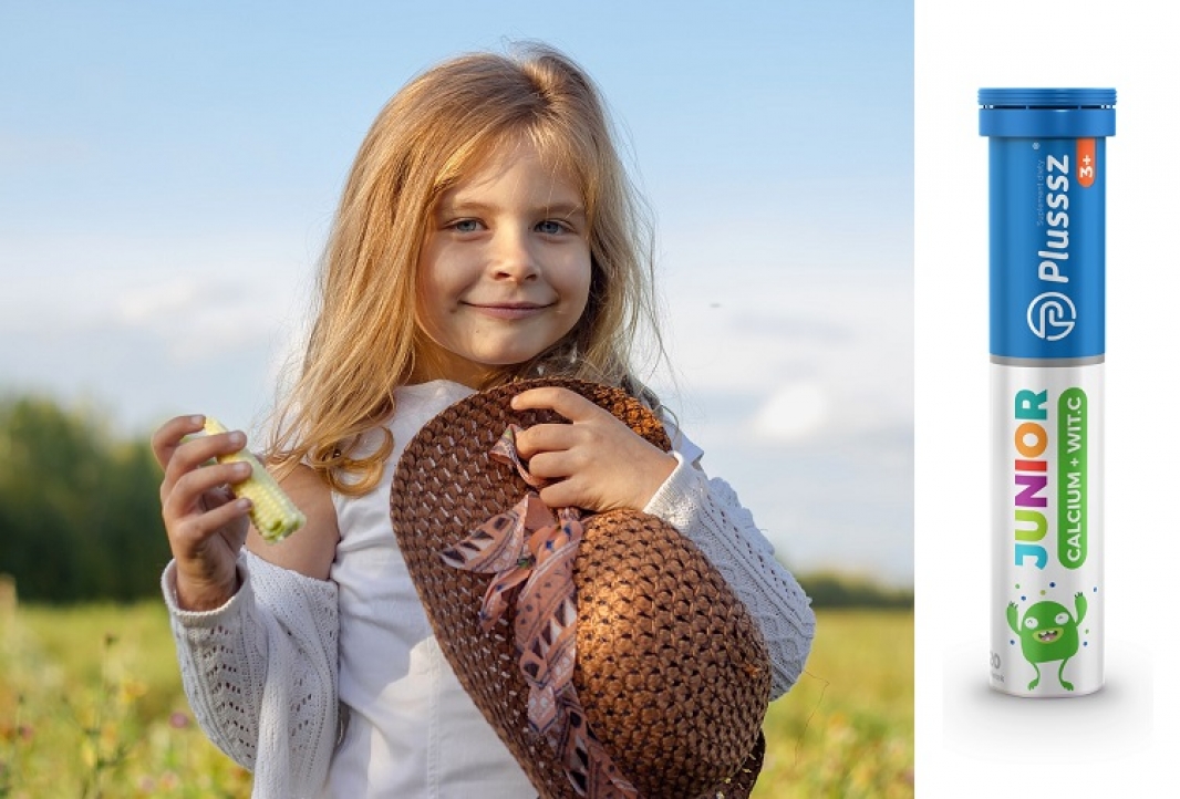Plusssz Junior Calcium + Wit. C to dwukolorowe tabletki musujące, które zmieniają zwykłą wodę w aromatyczny napój o smaku poziomek i pełen wartościowych składników, które pomagają nam dbać o zdrowie i dobre samopoczucie naszych dzieci w holistyczny sposób. Przeznaczony jest dla dzieci powyżej 3. roku życia. Jedna tabletka zaspokaja aż 50 proc. dziennego zapotrzebowania dziecka na witaminę C oraz dostarcza ¼ codziennej porcji wapnia. Owocowy smak i dobrany do potrzeb dzieci skład zapewnią naszym pociechom energię do zabawy i psot bez względu na pogodę za oknem.