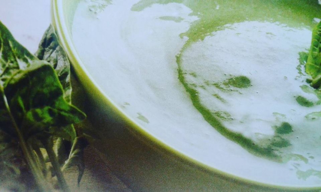 Szpinakowa zupa krem z kurczakiem, serem feta i prażonymi migdałami