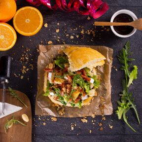 Pomarańczę obieramy, oczyszczamy z białych błonek, a następnie kroimy na plasterki, które dzielimy na trójkątne kawałki. Lekko wystudzone pączki przekrawamy na około 2/3 wysokości. Dół smarujemy powidłami śliwkowymi, a następnie układamy na nich naprzemiennie wszystkie składniki sałatki. Całość, tuż przed podaniem, skrapiamy dressingiem i podajemy wraz z górną częścią pączka.