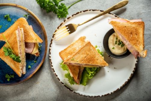 - Kromki pieczywa tostowego ułóż na blaszce i zapiecz w piekarniku z dwóch stron, używając funkcji grill lub przygotuj w tosterze. Zapieczone tosty posmaruj majonezem i ułóż na nich po plasterku szynki i sera.