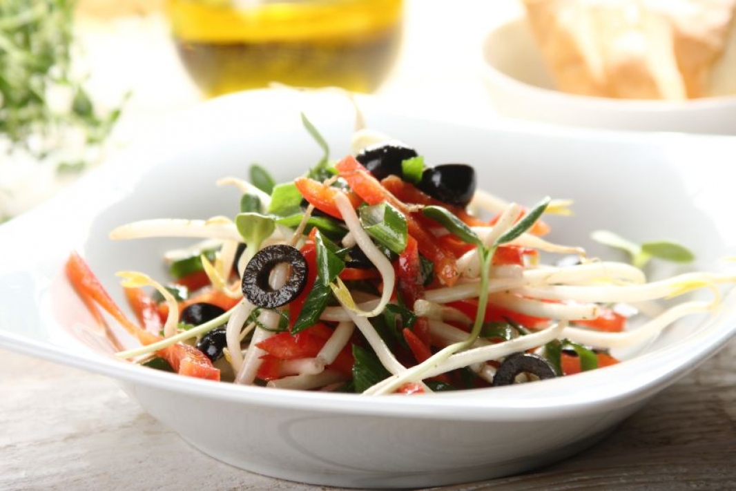 - W misce połącz kiełki, paprykę, oliwki oraz pokrojony szczypior. Dodaj przygotowany sos i wszystko delikatnie wymieszaj. Gotową sałatkę przełóż do salaterki i podawaj.